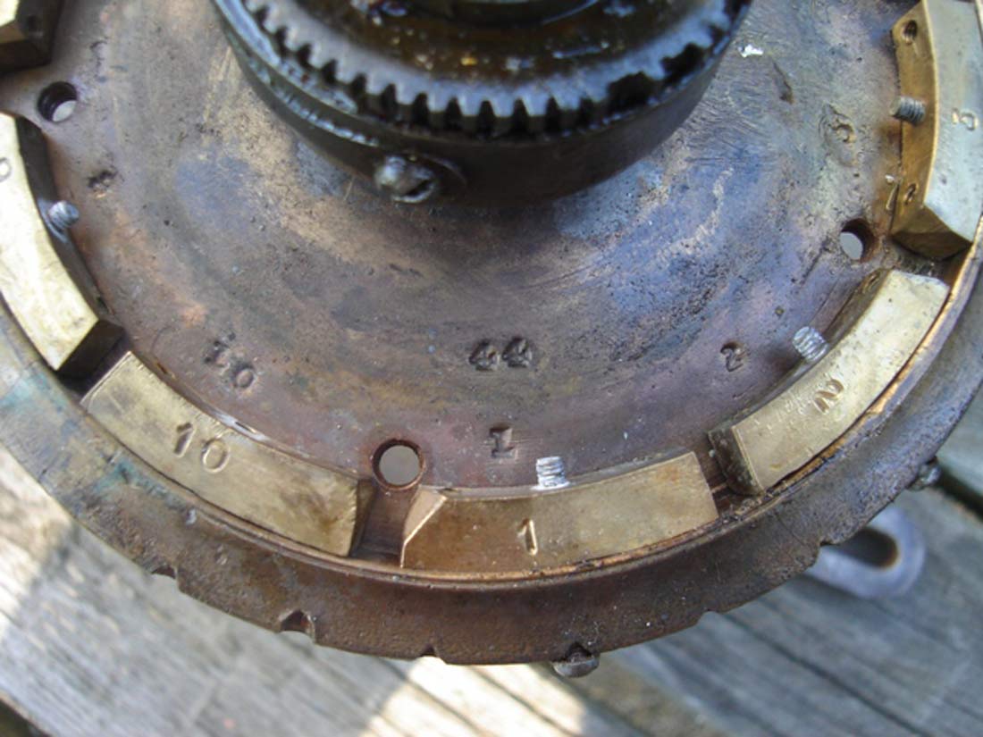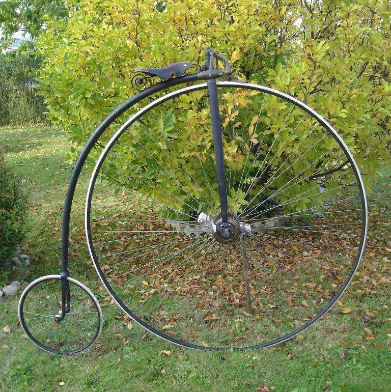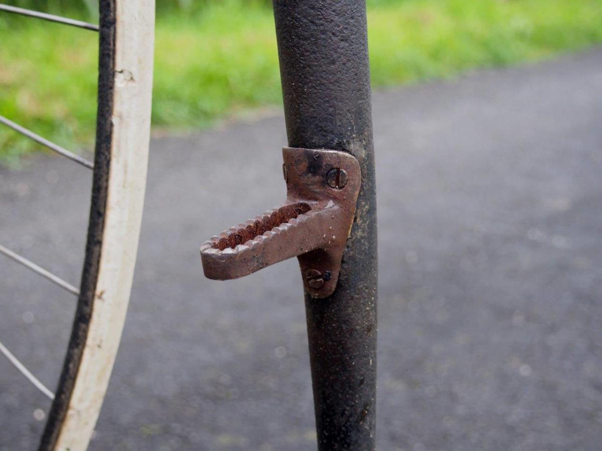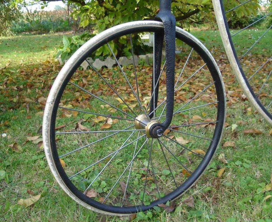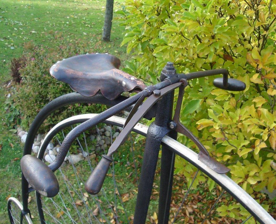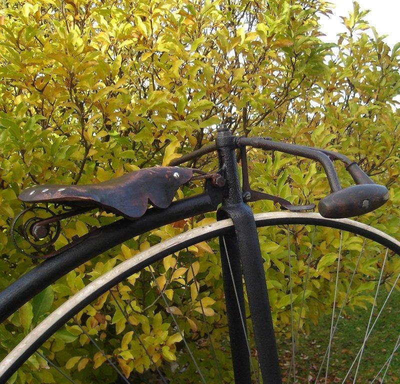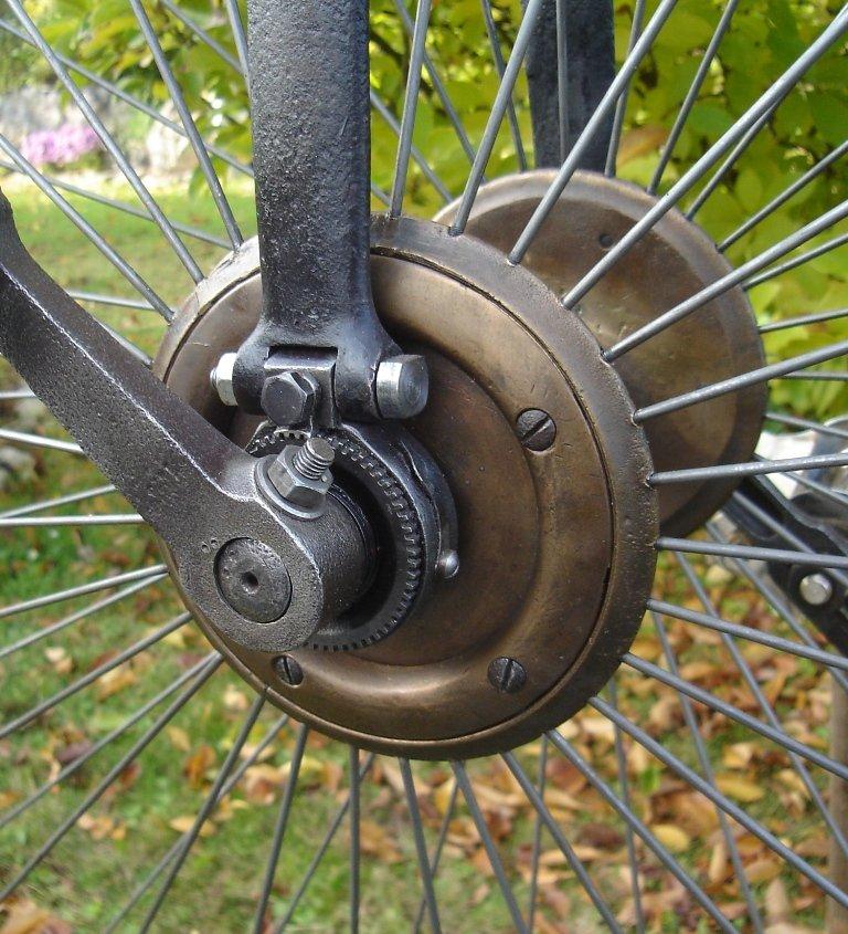 This ordinary was restored in a very sympathetic way in 2012. Owner had to add new spokes, a replica rear hub and replica brake handle and spoon. It was worth the effort, since this Morris Brothers ordinary has a very special front hub.